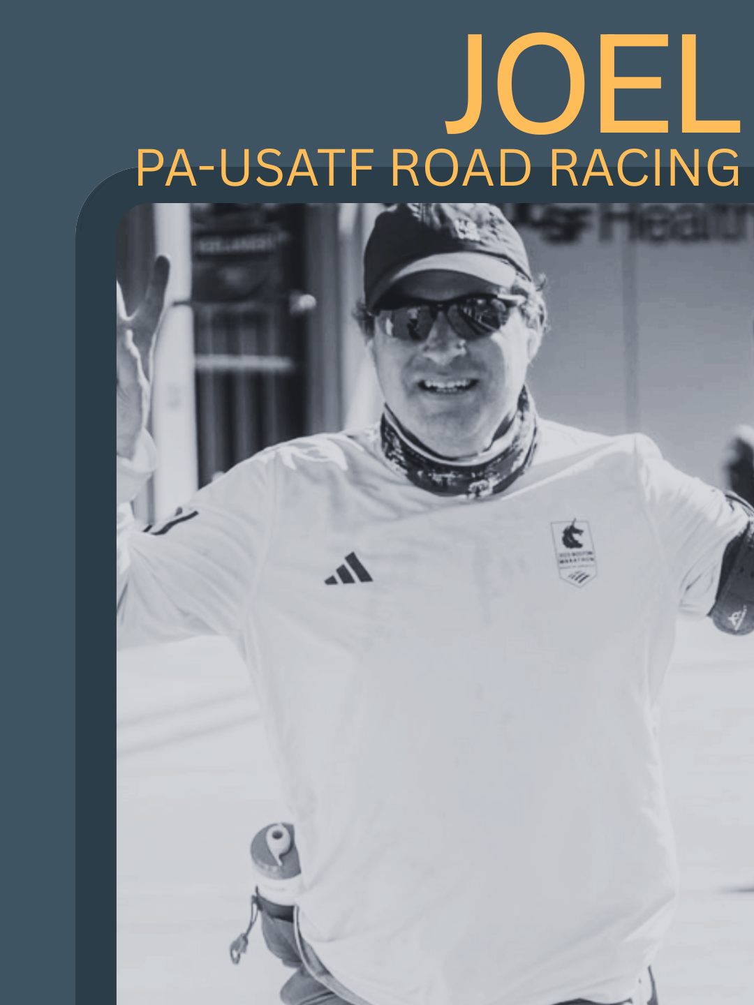 Joel recently joined a local competitive team but has significant time constraints as the sole caretaker for two children. One is five months old! He'd like to do well in the PA-USATF Road Grand Prix, even though he can only run one day a week. A couple of marathons await in the distance as well.