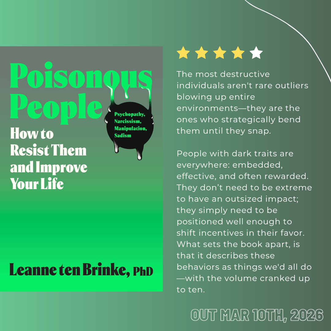 In Poisonous People, Leanne ten Brinke insists that people with dark traits are everywhere: embedded, effective, and often rewarded. They don’t need to be extreme to have an outsized impact; they simply need to be positioned well enough to shift incentives in their favor. What sets the book apart, is that it describes these behaviors as things we'd all do—with the volume cranked up to ten.
